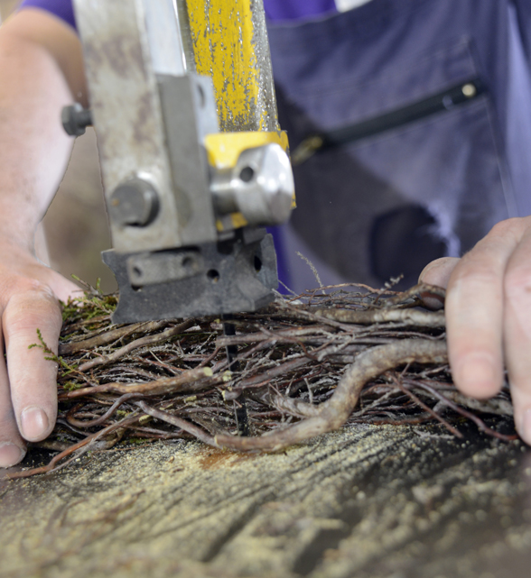 The bark is removed using a specially adapted shot blasting machine. The heather being tumbled while shot is fired at it to chip away the bark and leave the cleaned stems. The heather is then carefully graded by size and collected into bundles – a mix of different thicknesses of stem will help bind and strengthen the finished jewellery. The variety of stems is vital to make the block as solid as possible, a process requiring considerable experience.